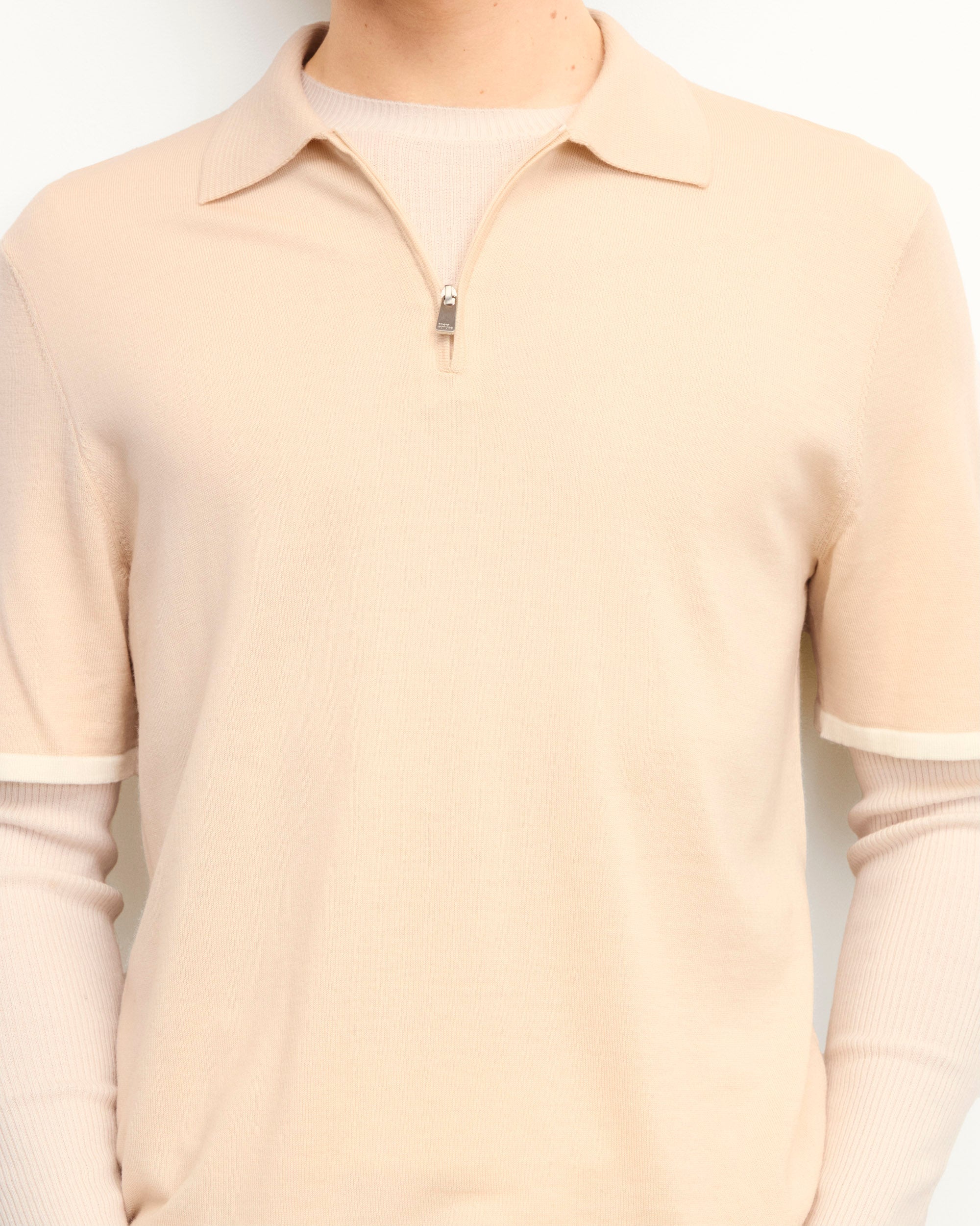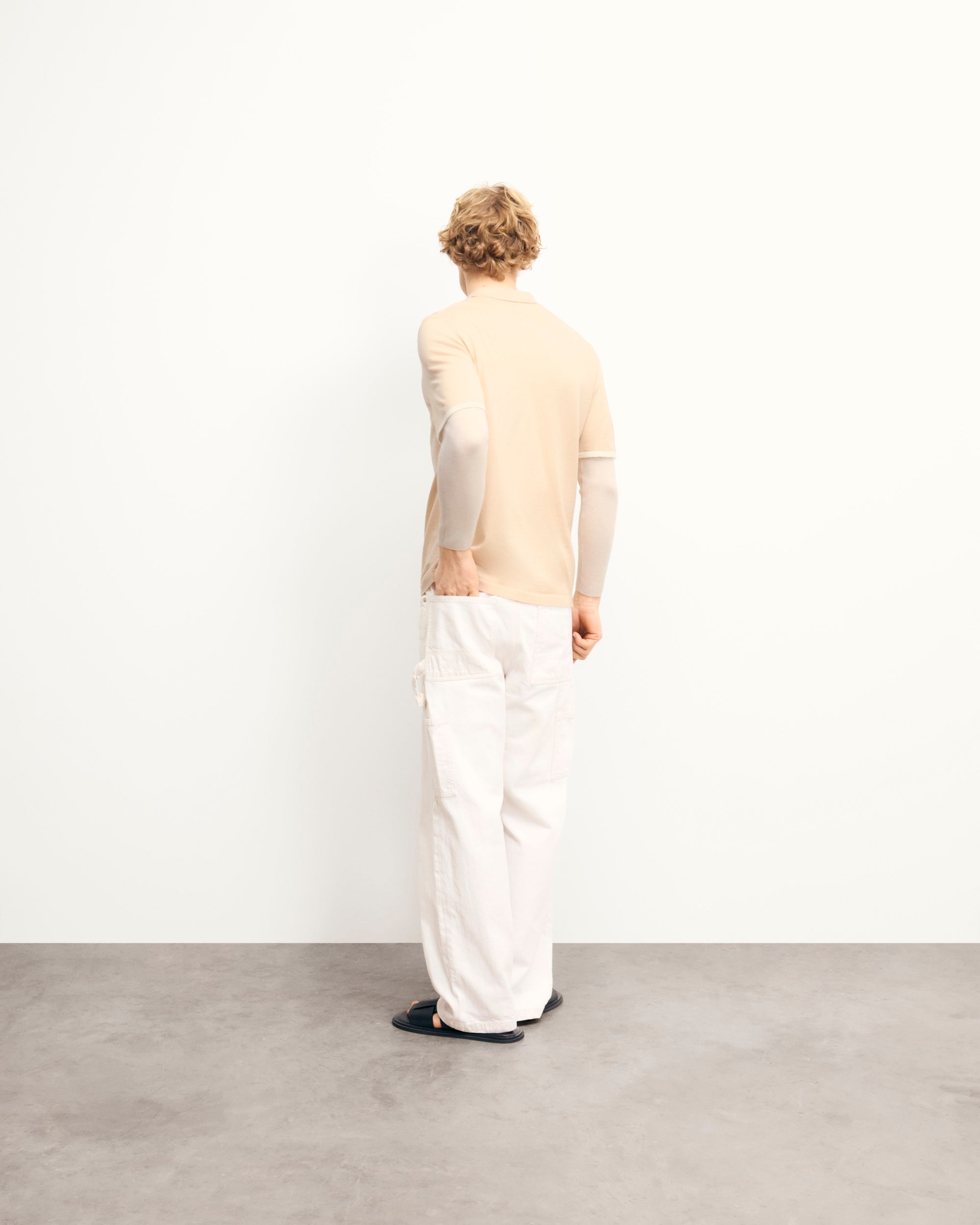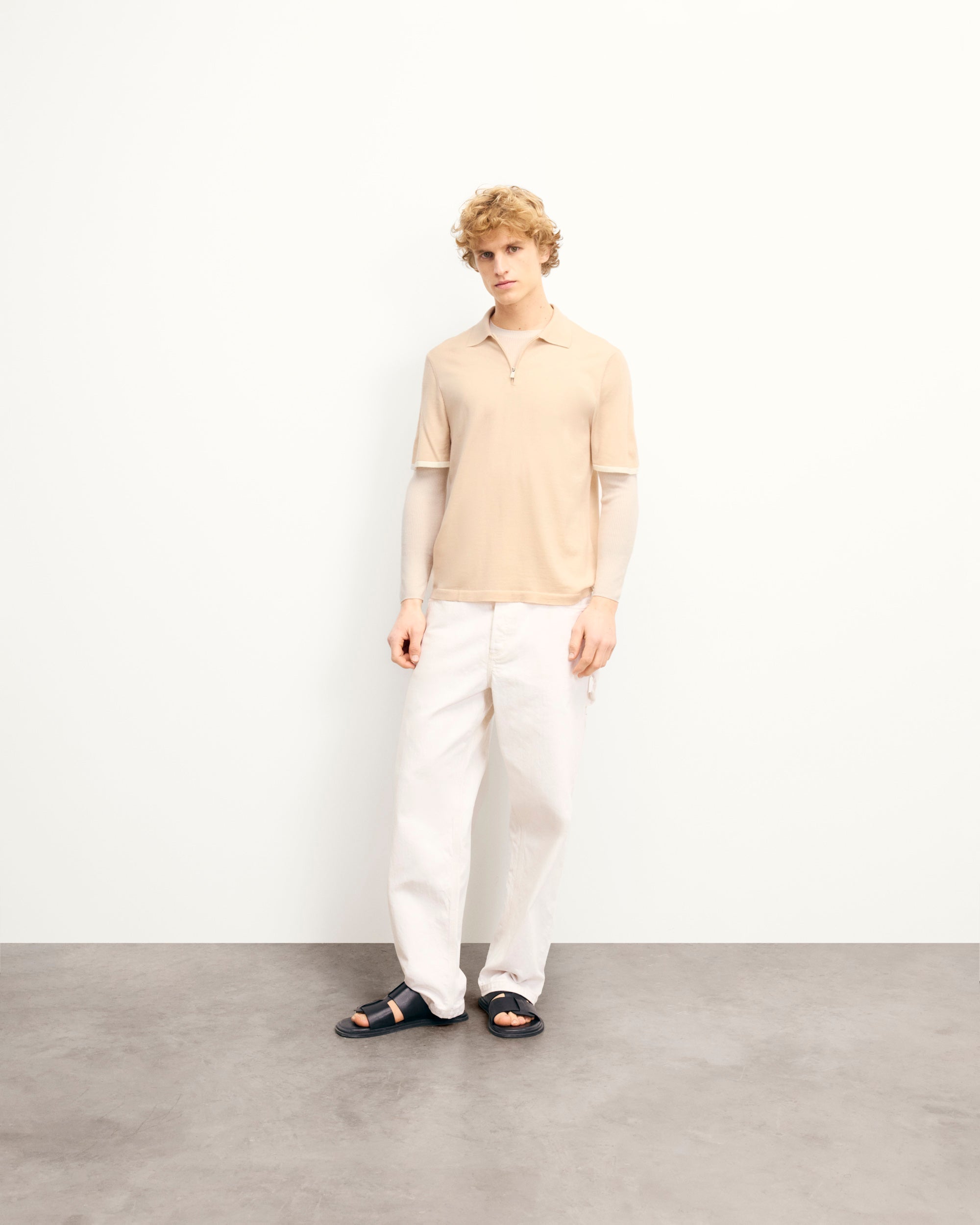 100% merino wool.Merino wool has the particularity of being temperature regulating. It is therefore ideal for wearing next to the skin in spring and summer.Hand washingFabric softener and bleaching prohibitedDo not tumble dryDry cleaning prohibitedIron at low temperature