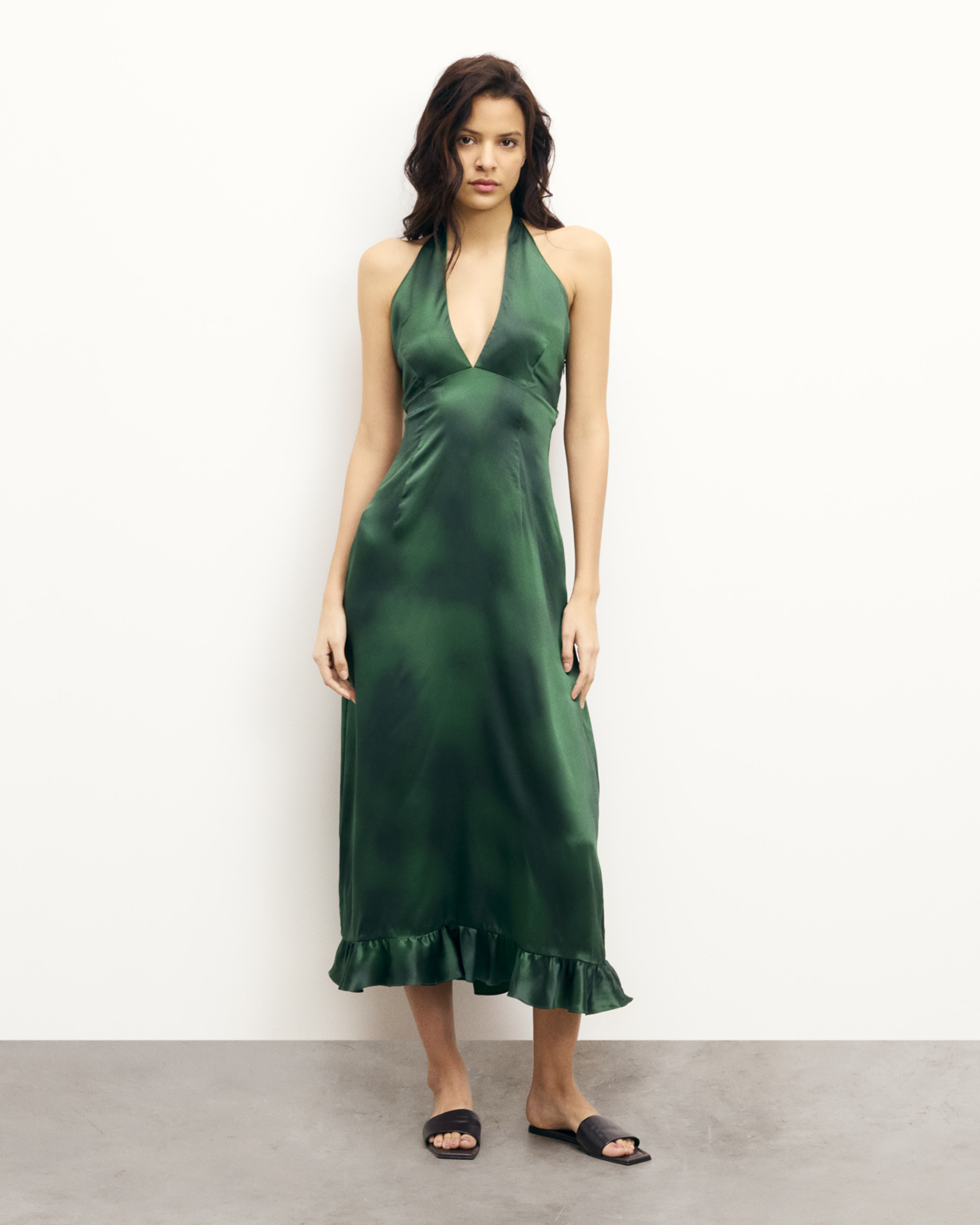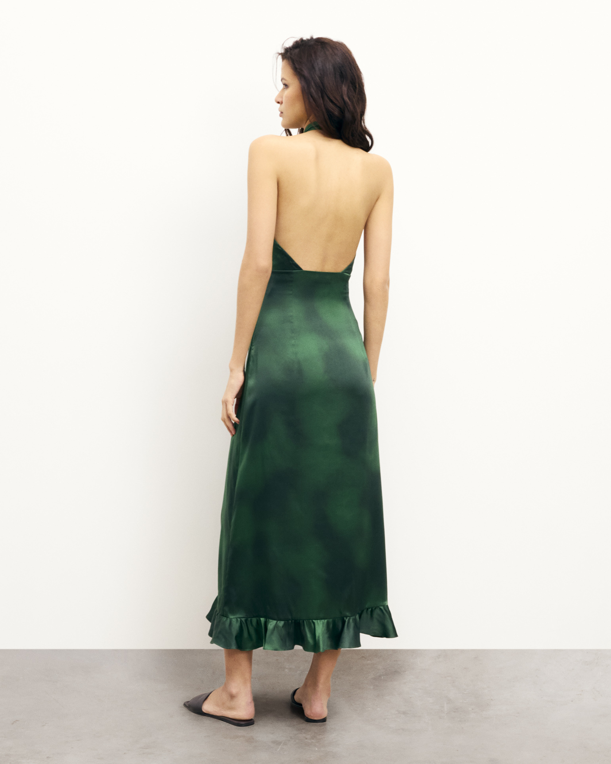 Adorned with a blurred print, this sleeveless maxi dress creates a flowing silhouette. A cross front and cutout detail reveals a captivating bare back.