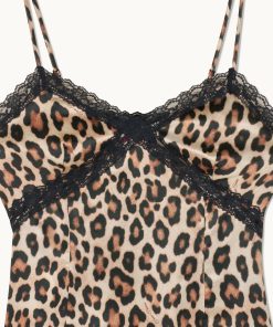 This daring silk satin mini dress combines a bold leopard print with delicate lace details. Thin adjustable straps, a V-neckline, and an asymmetrical skirt make it perfect for any occasion.