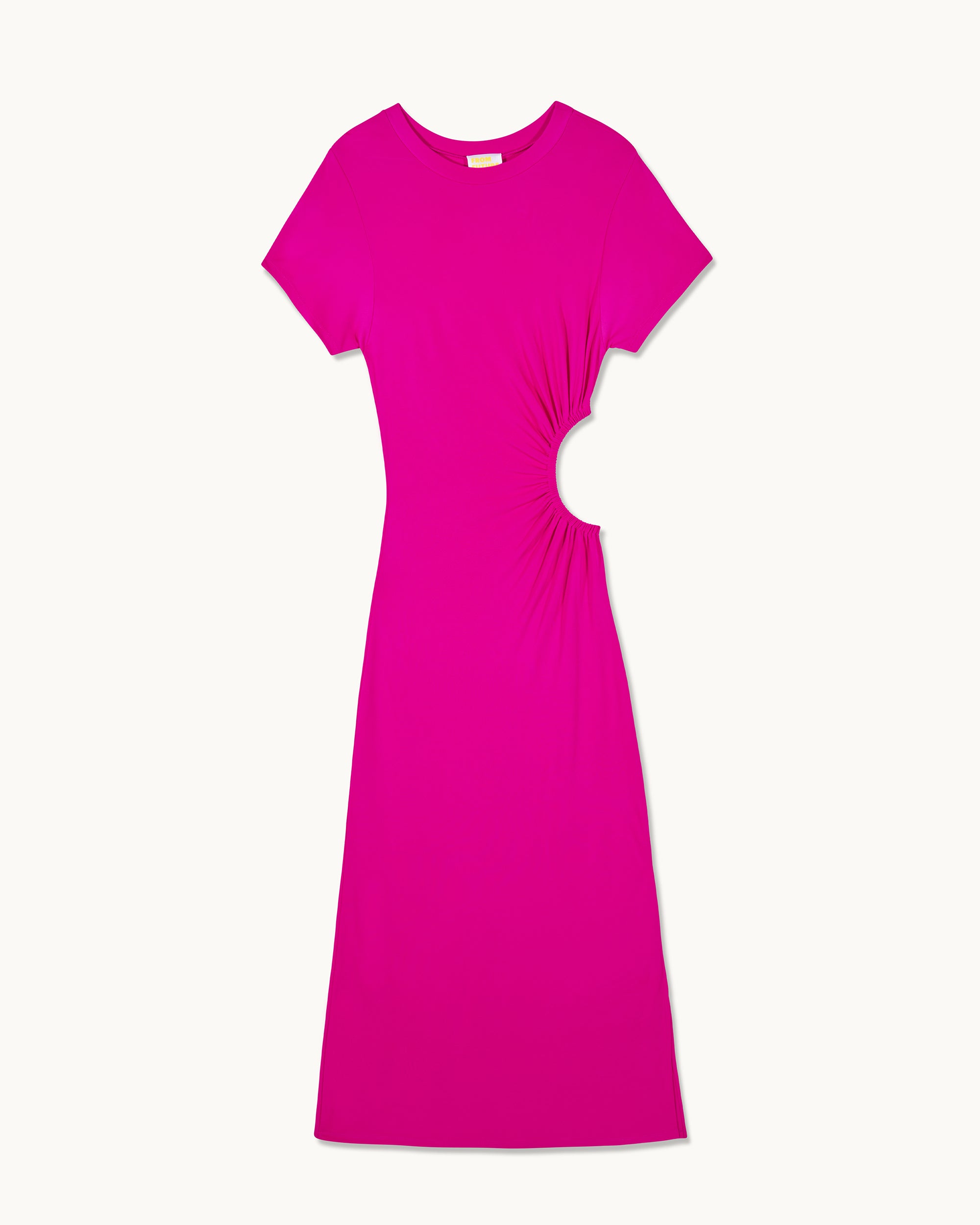 Adorned with a gathered cutout at the waist, this statement maxi dress takes you from day to night. With a classic crew neck and short sleeves, it reveals a daring side slit for a striking silhouette.