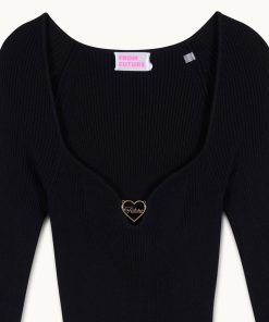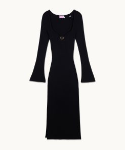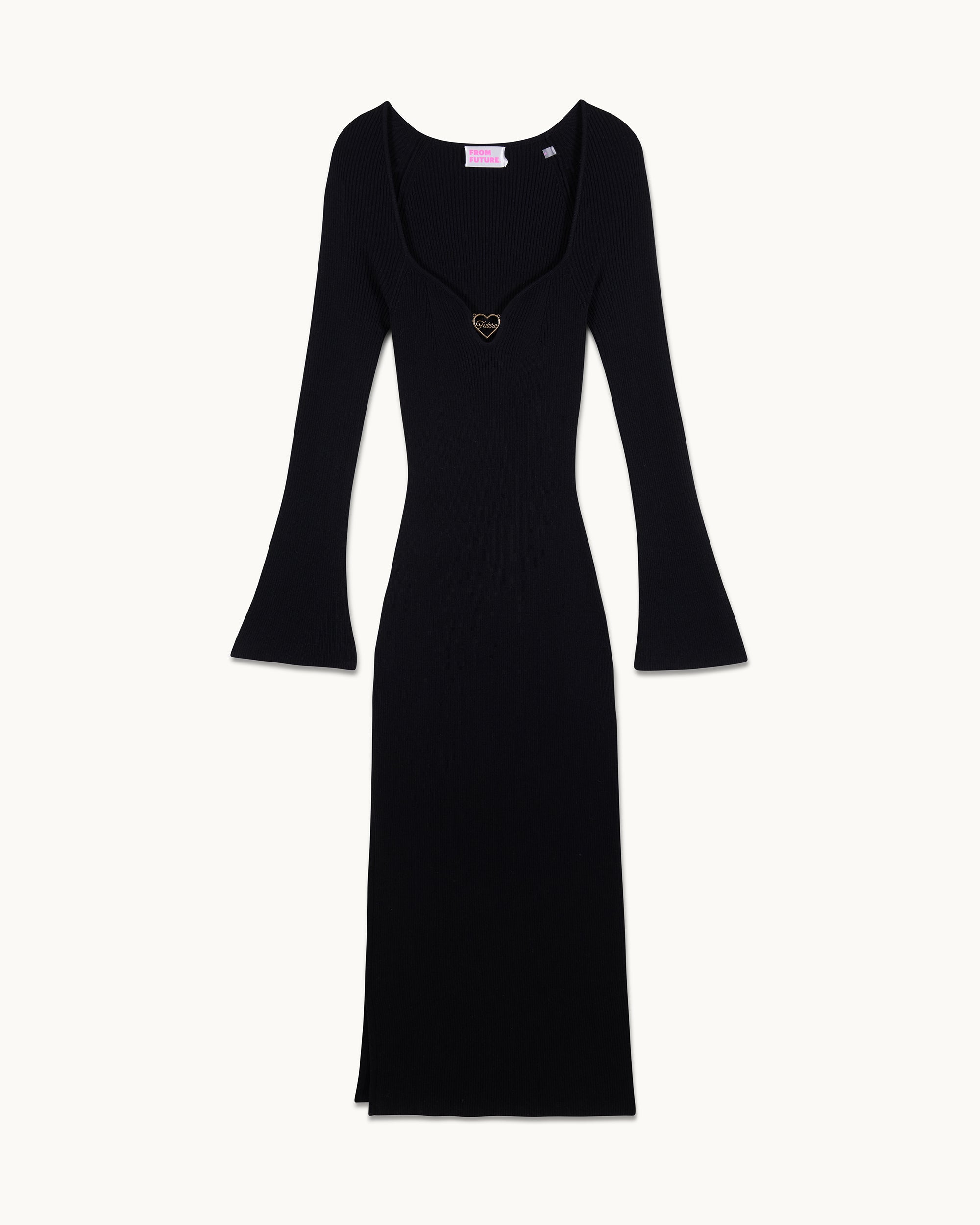 A versatile and elegant piece, perfect for both day and night. This long 4-ply merino wool dress features a daring neckline adorned with a cutout and heart-shaped jewel. Flared cuffs and a slit skirt create a striking silhouette. A versatile and elegant piece, perfect for both day and night.