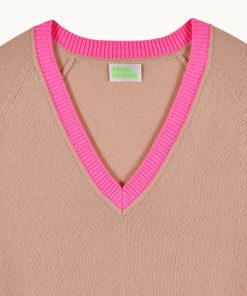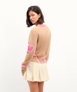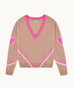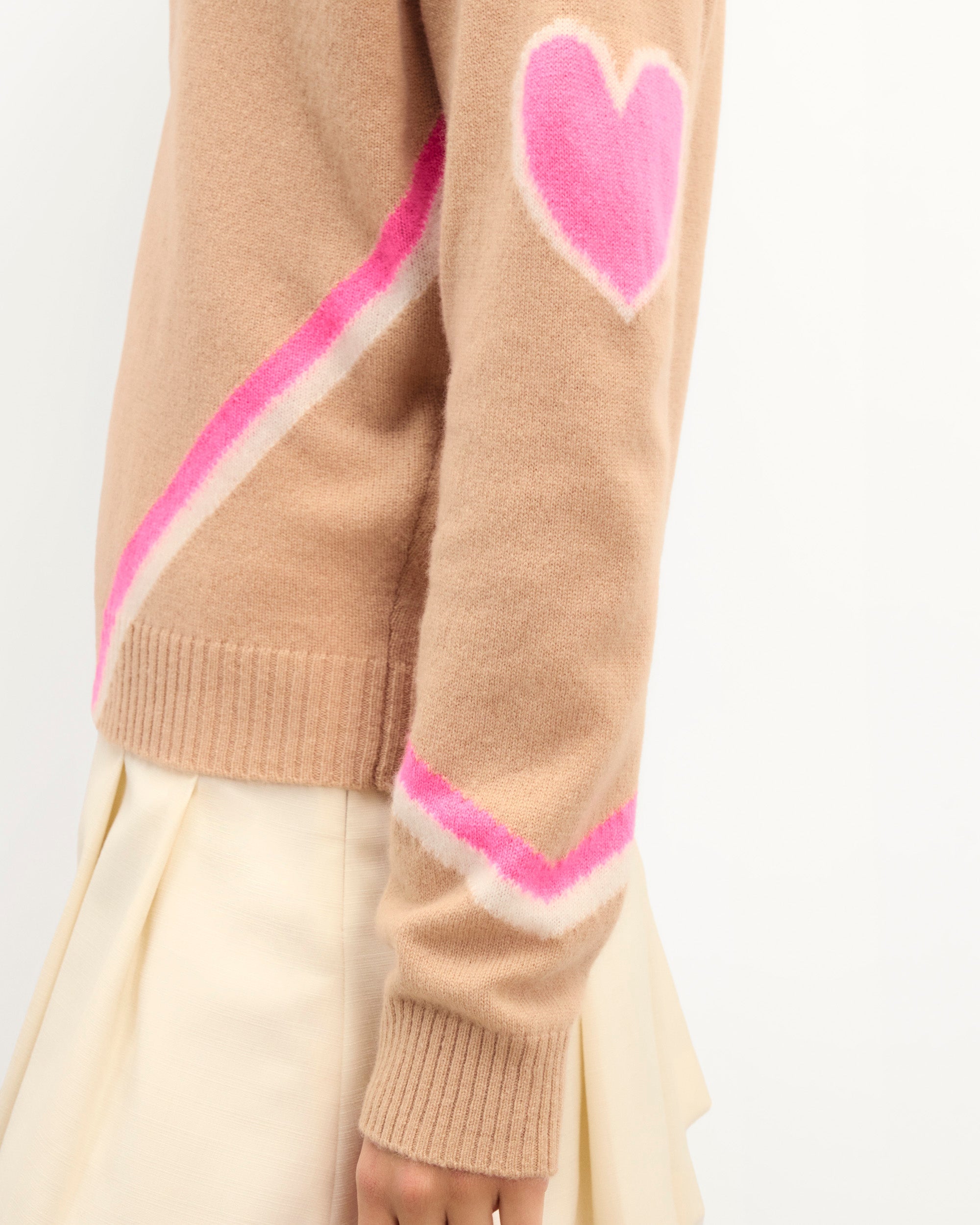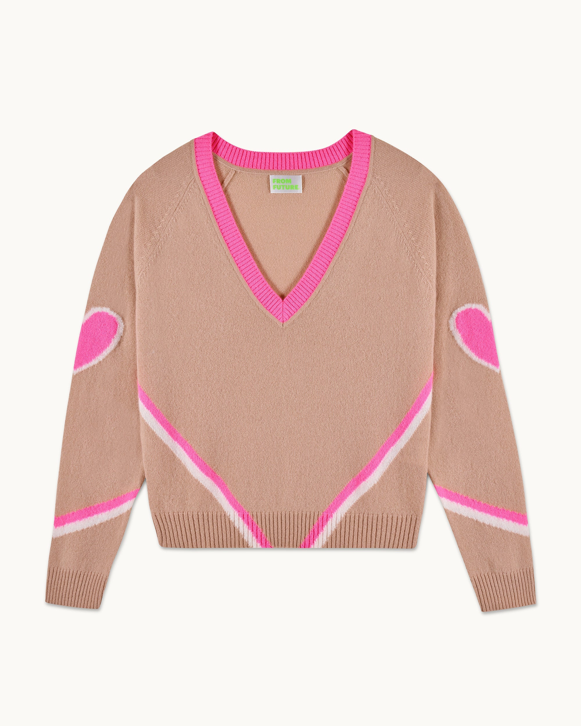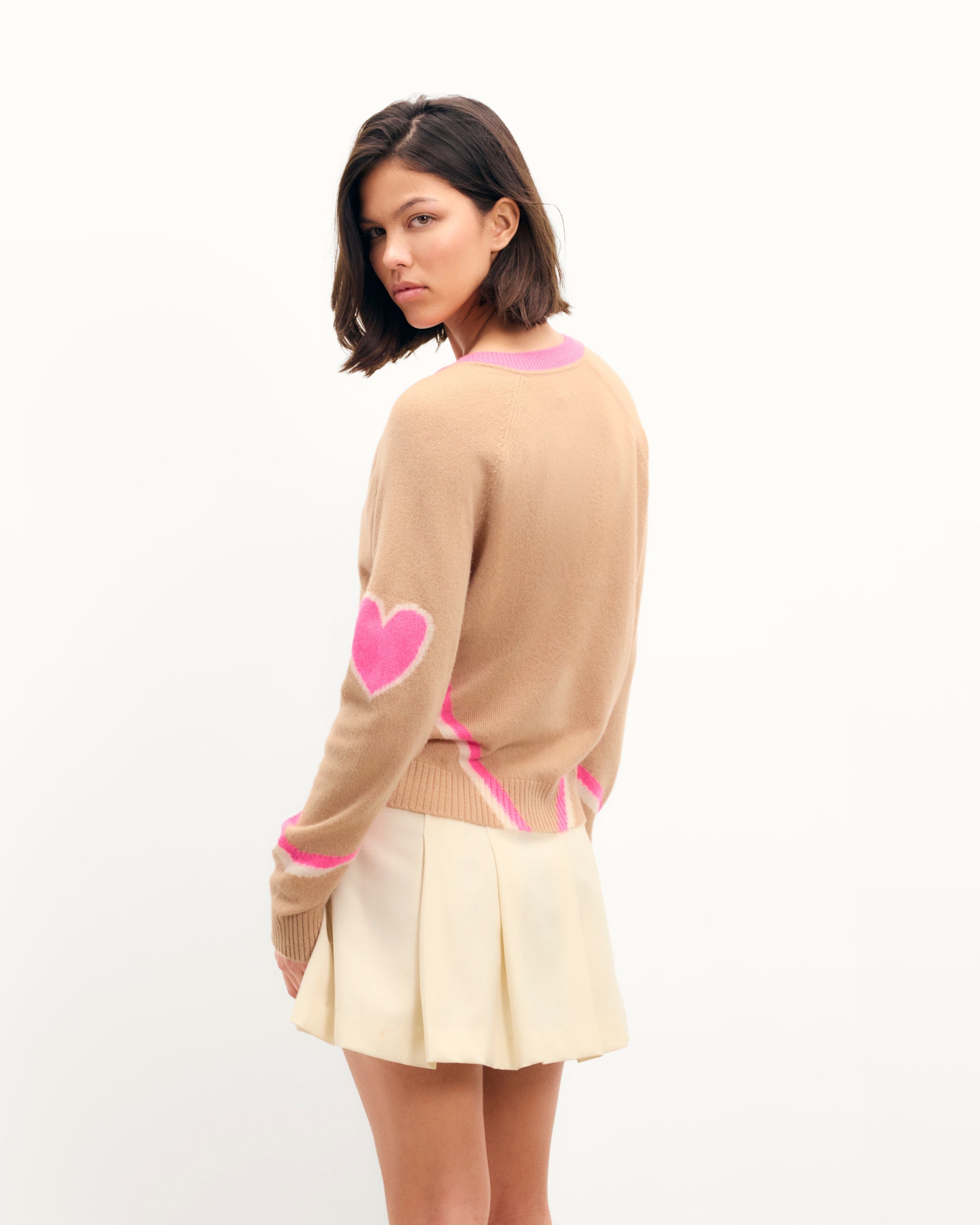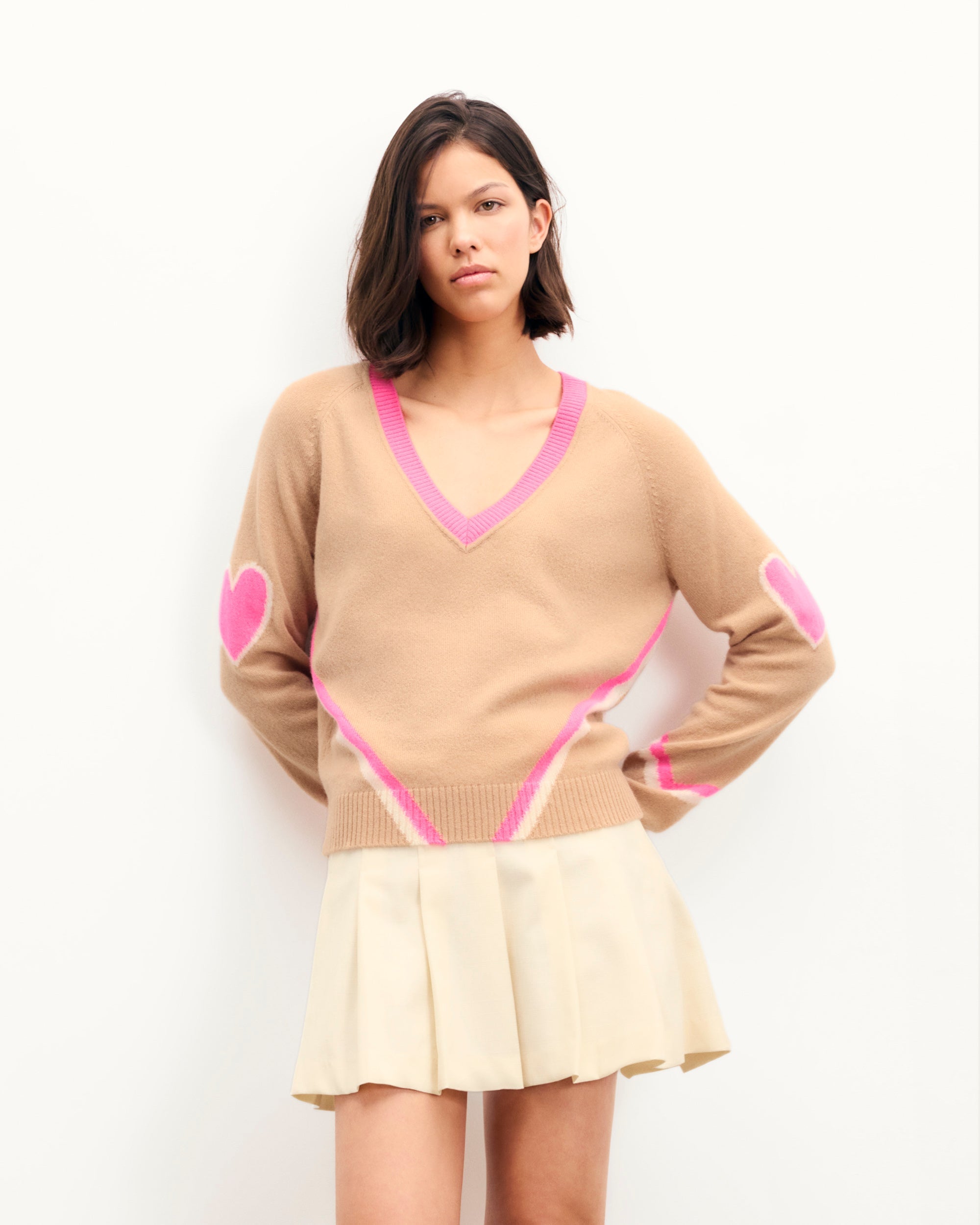 Vibrant hearts and bands adorn this 4-ply cashmere sweater, making a bold statement. The structured V-neck, long sleeves, and ribbed edges create a sophisticated silhouette. Layer over a shirt and pair with tailored pants for a chic look.